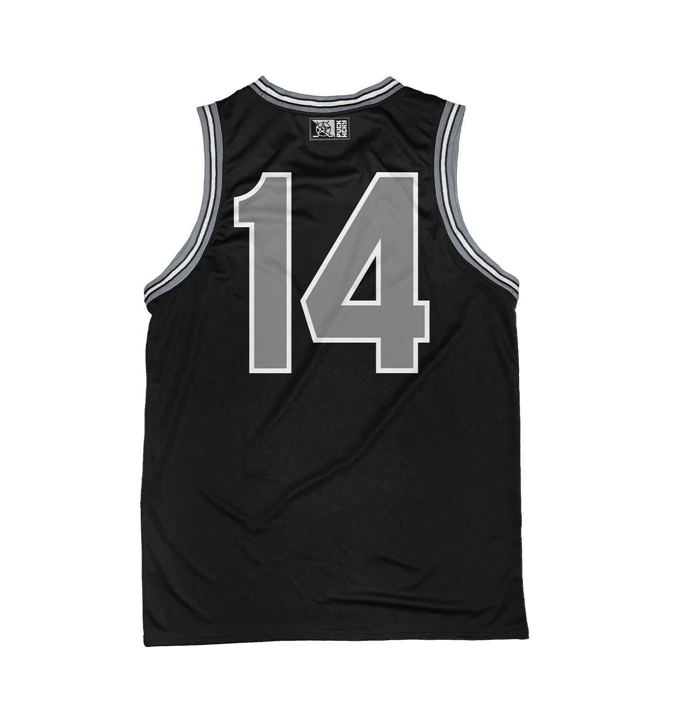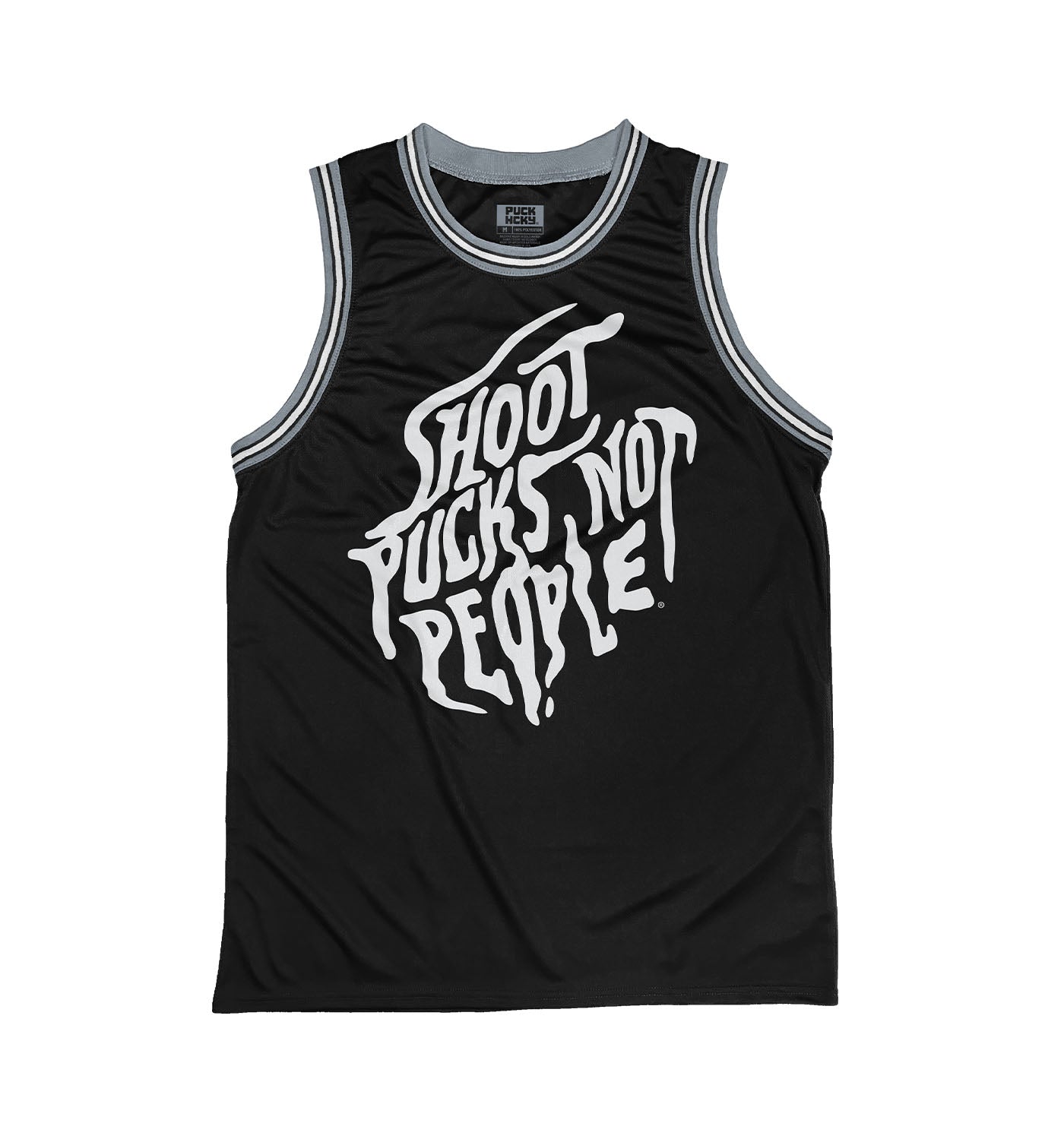PUCK HCKY 'SHOOT PUCKS NOT PEOPLE - DRIPPY SCRIPT' sleeveless basketball jersey in black, grey, and white