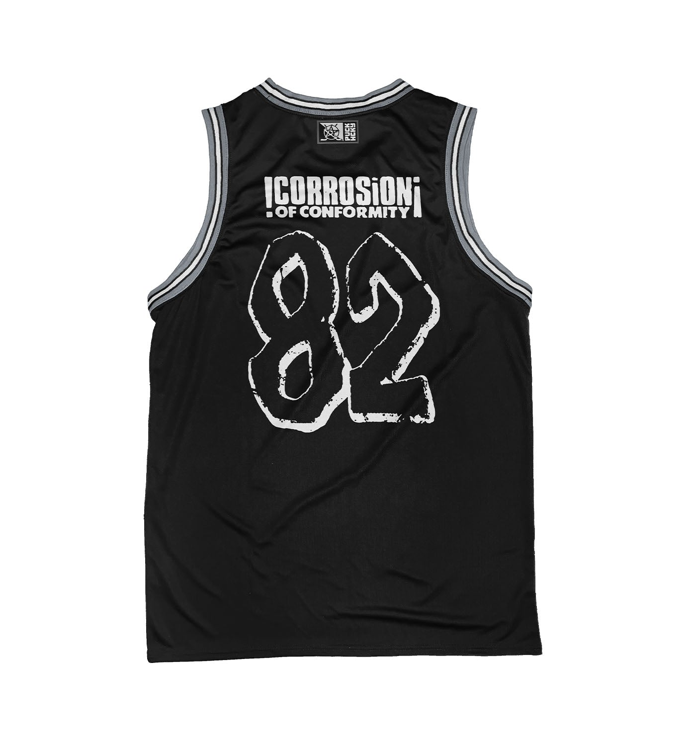 CORROSION OF CONFORMITY 'SKULL' sleeveless basketball jersey in black, grey, and white