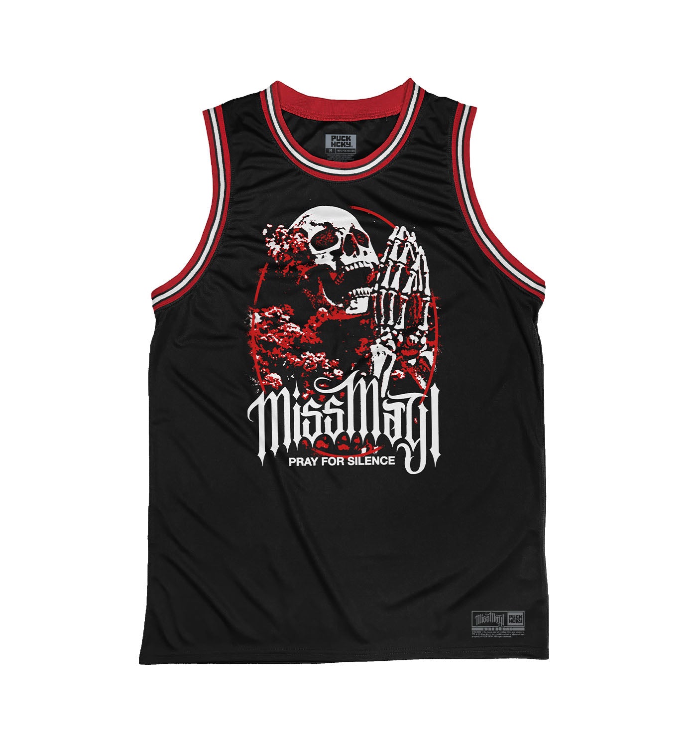 Miss May I 'Silence' sleeveless basketball jersey in black, red, and white