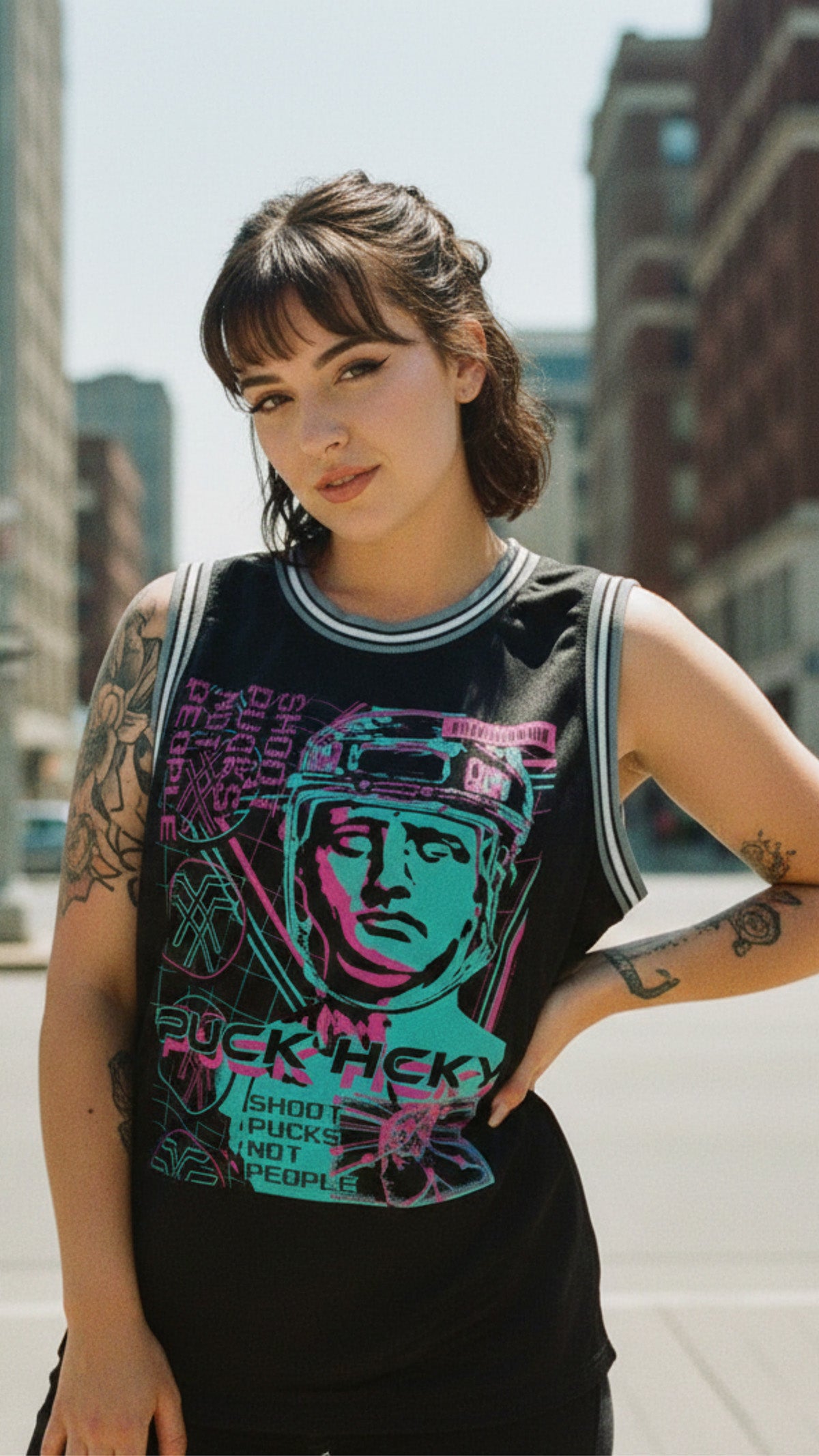 PUCK HCKY 'VAPORWAVE' sleeveless basketball jersey in black, grey, and white