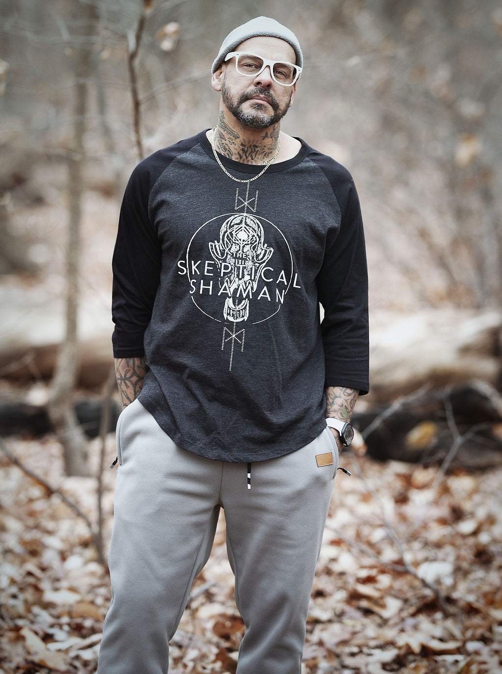 TOTEM 'Skeptical Shaman' raglan in graphite heather with black sleeves