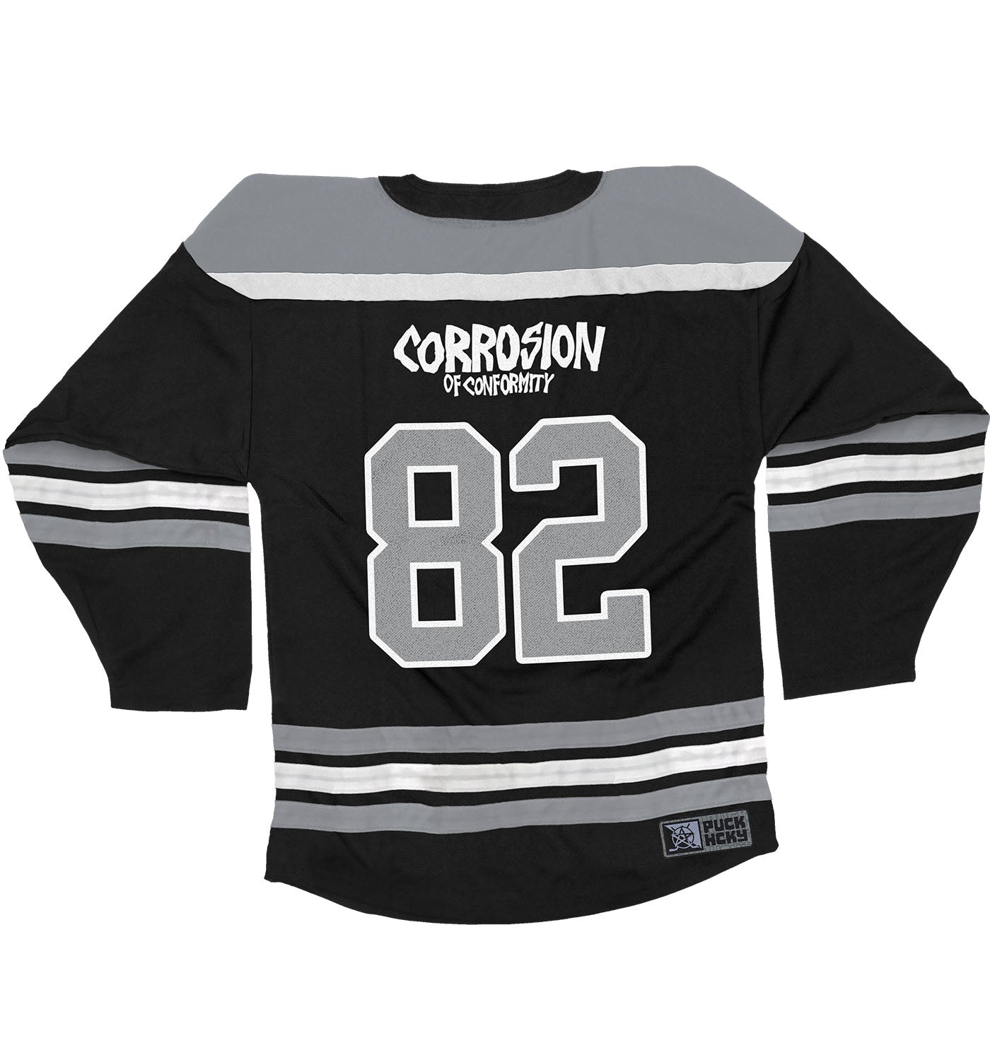 CORROSION OF CONFORMITY 'SKULL' deluxe hockey jersey in black, grey, and white